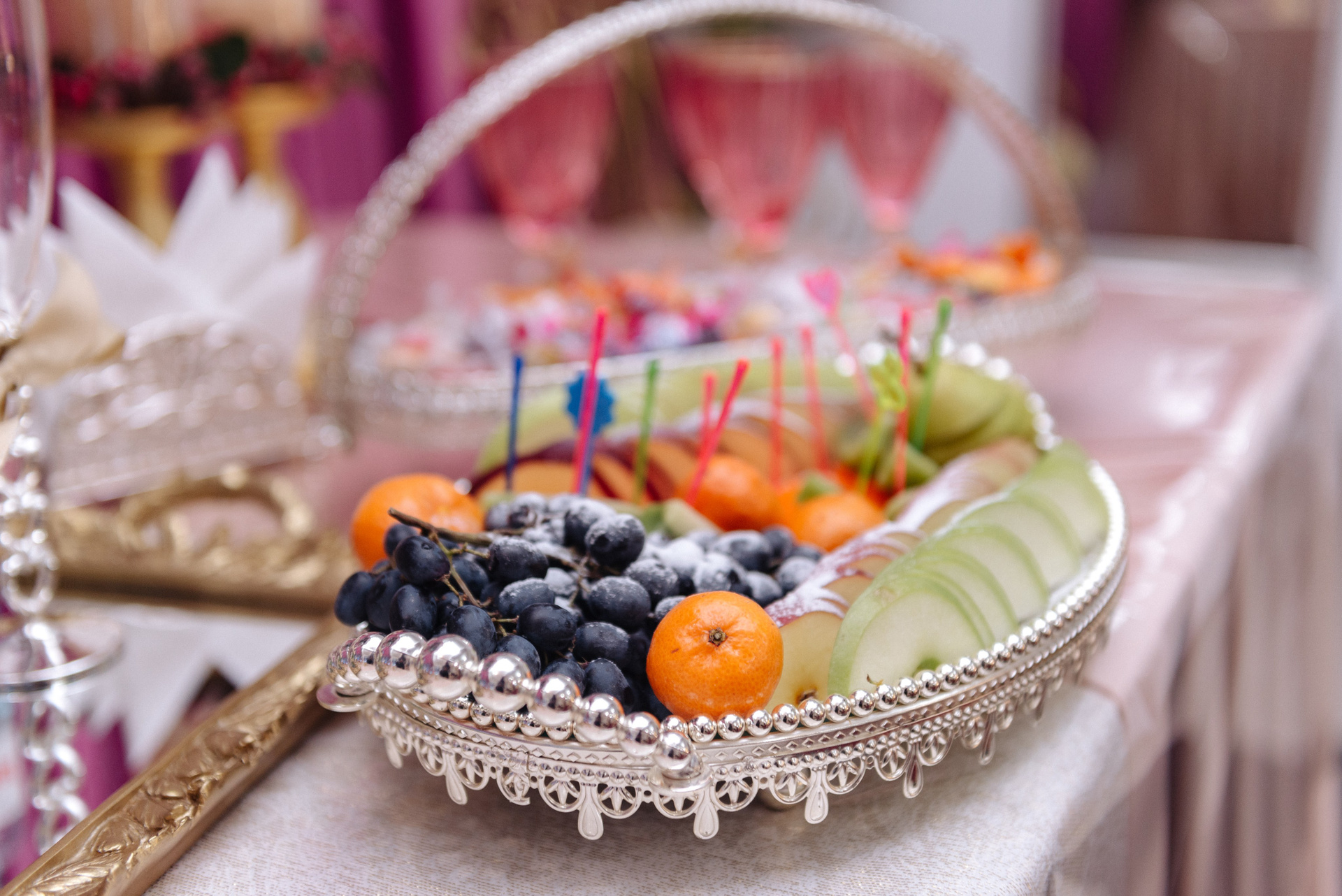 - Фуршет для гостей -20 000 тг (натуральный сок 1 л — 1 шт, вода 0,5 л. — 3 шт, шампанское -1 шт, фруктовая нарезка, конфеты)